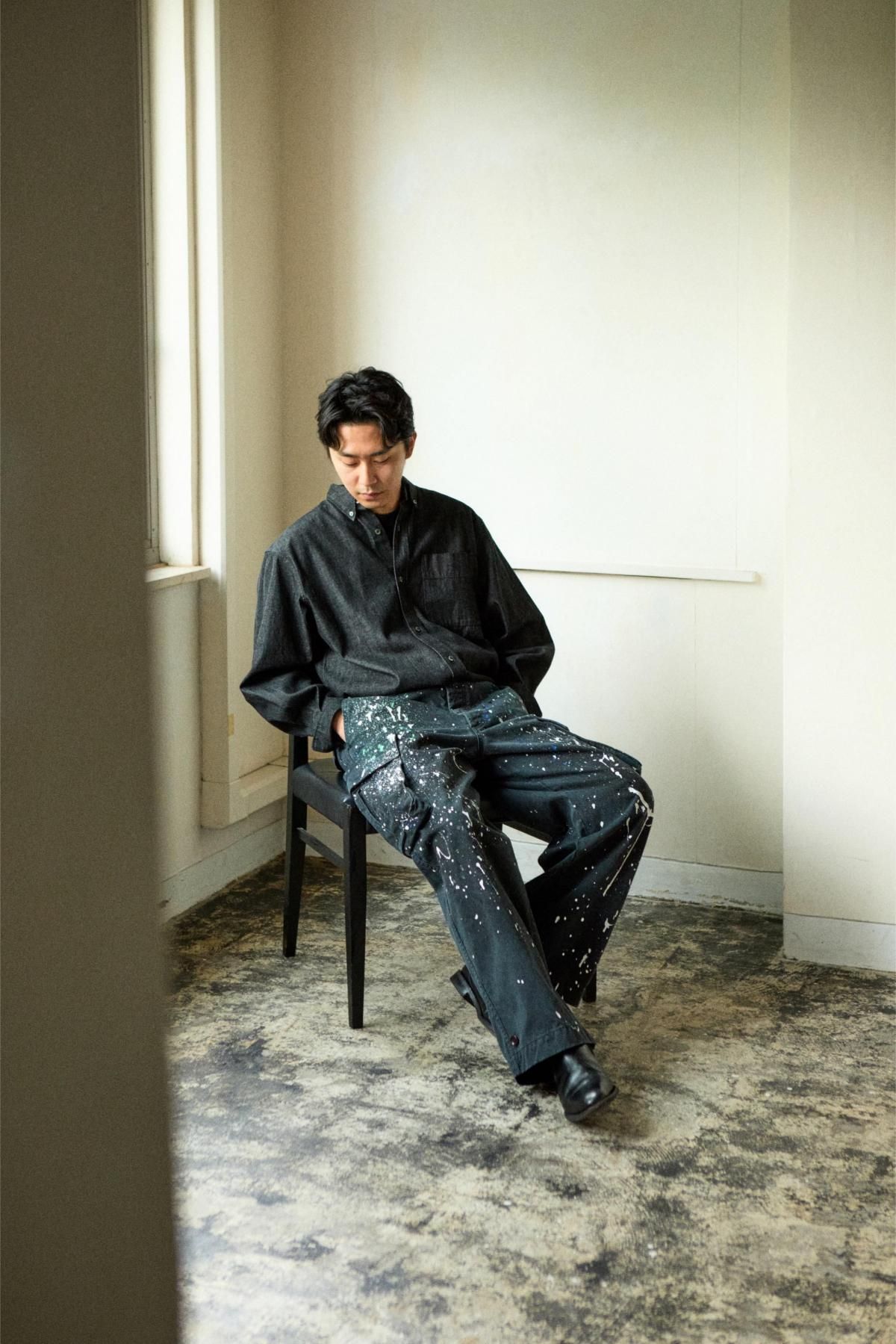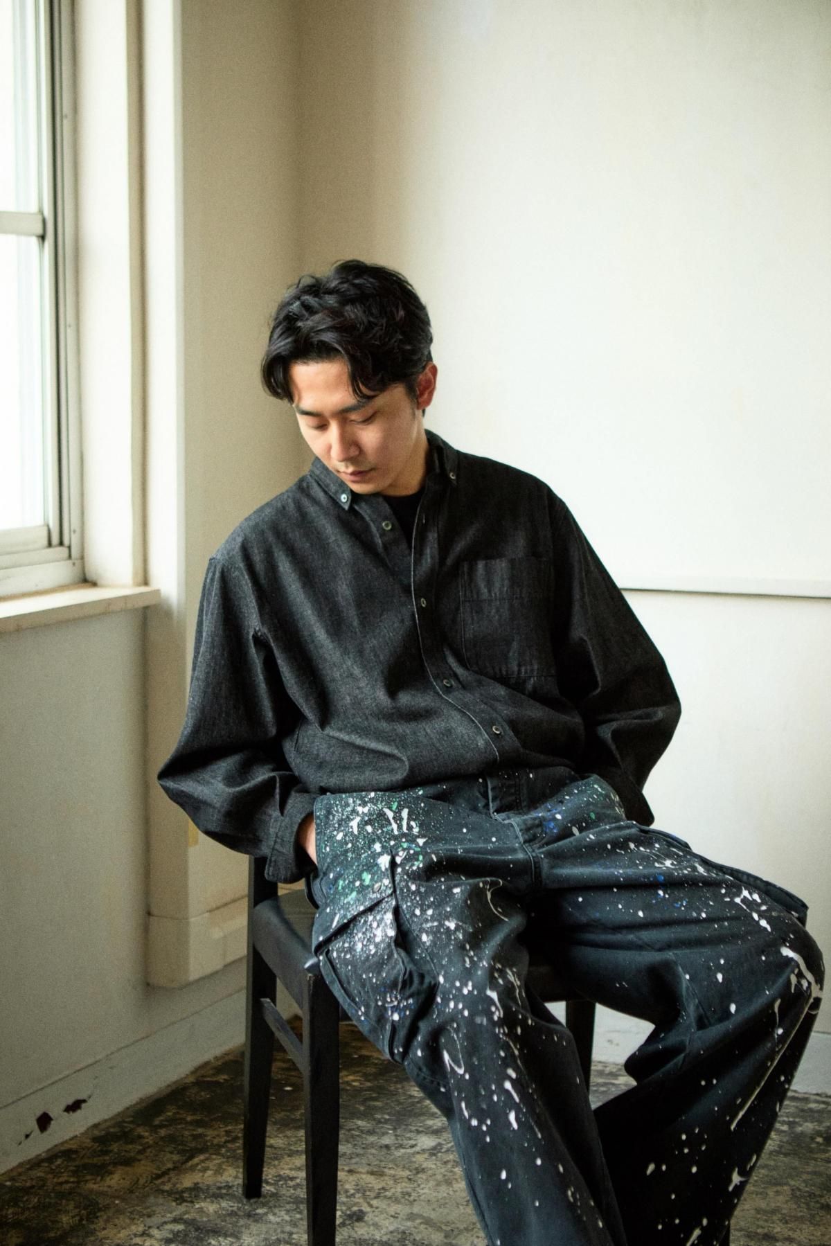 8ozのムラデニムを使用。程よいスラブ感でライトオンスながらも深みのある表情が特徴。ワンウォッシュ加工を施し、独特な風合いと生地の柔らかさを引き立たせている。フロントの6釦はオリジナルの刻印入りシェル。少しゆったりとしたバランスの良いシルエット。一枚半袖を採用し、フラットになりすぎない立体的な形状に設計。通常のボタンダウンシャツに多く取り入れられるのはセンターボックスだが、サイドタックを入れることで肩周りの動きが取りやすいようにしている。縫い代には全て折り伏せ縫いを採用し、ドレス要素も含めて上品に仕上げた。