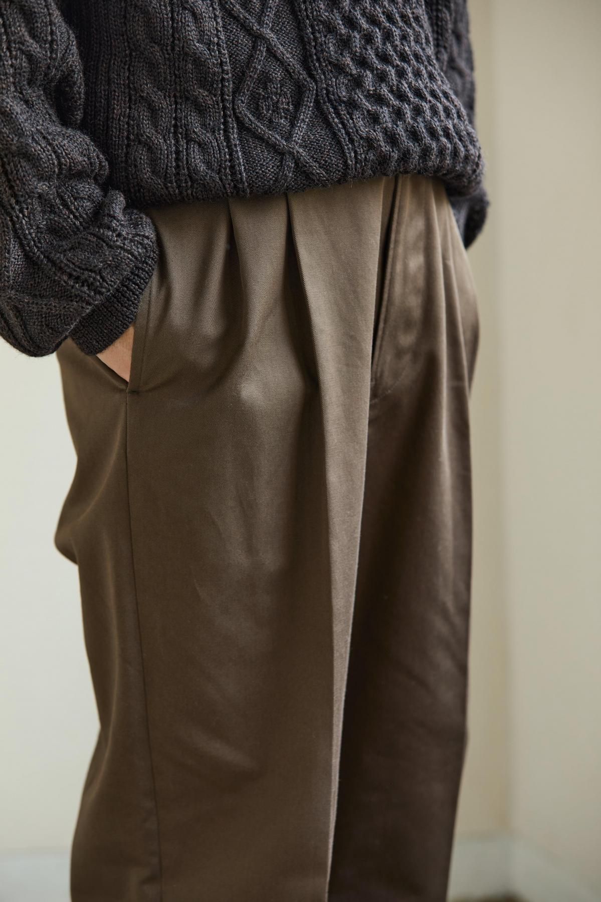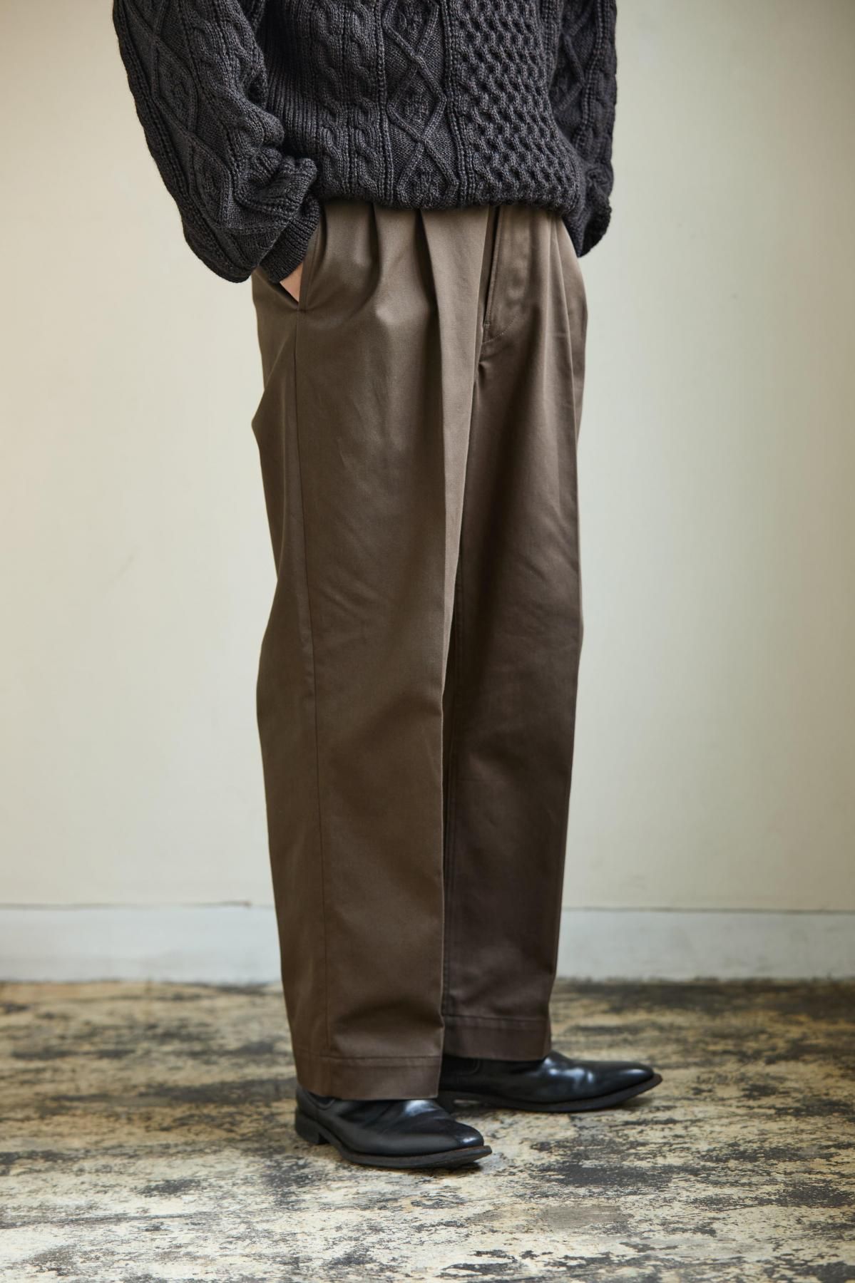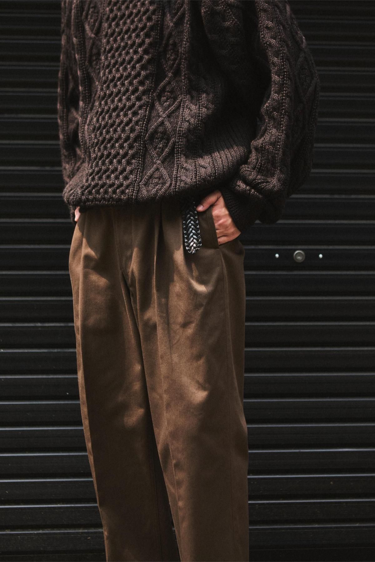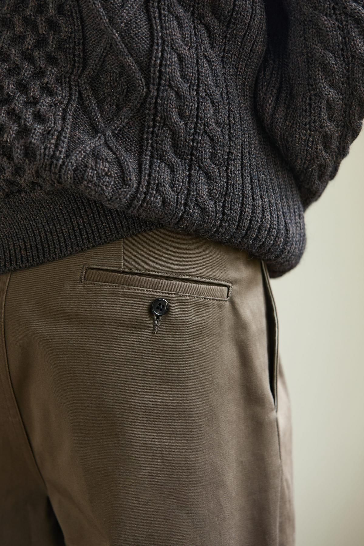 綿糸の紡績工程で夾雑物や短い繊維を徹底的に取り除き、毛羽立ちが少なく光沢に優れた上質なコーマ糸を使用。滑らかさとしなやかさを兼ね備えた、上品で強度のあるチノクロス。ツータックのワイドテーパード型。股上を深くして脇線をカーブさせた綺麗なシルエットが特徴。フロントはジッパーフライ仕様。内掛け釦付きでフィット感を高めることが可能。ピスポケットは片玉縁の釦留め。マーブル調の釦にはバッファローホーンを使用。全体的にクラシック感のある雰囲気に仕上げている。