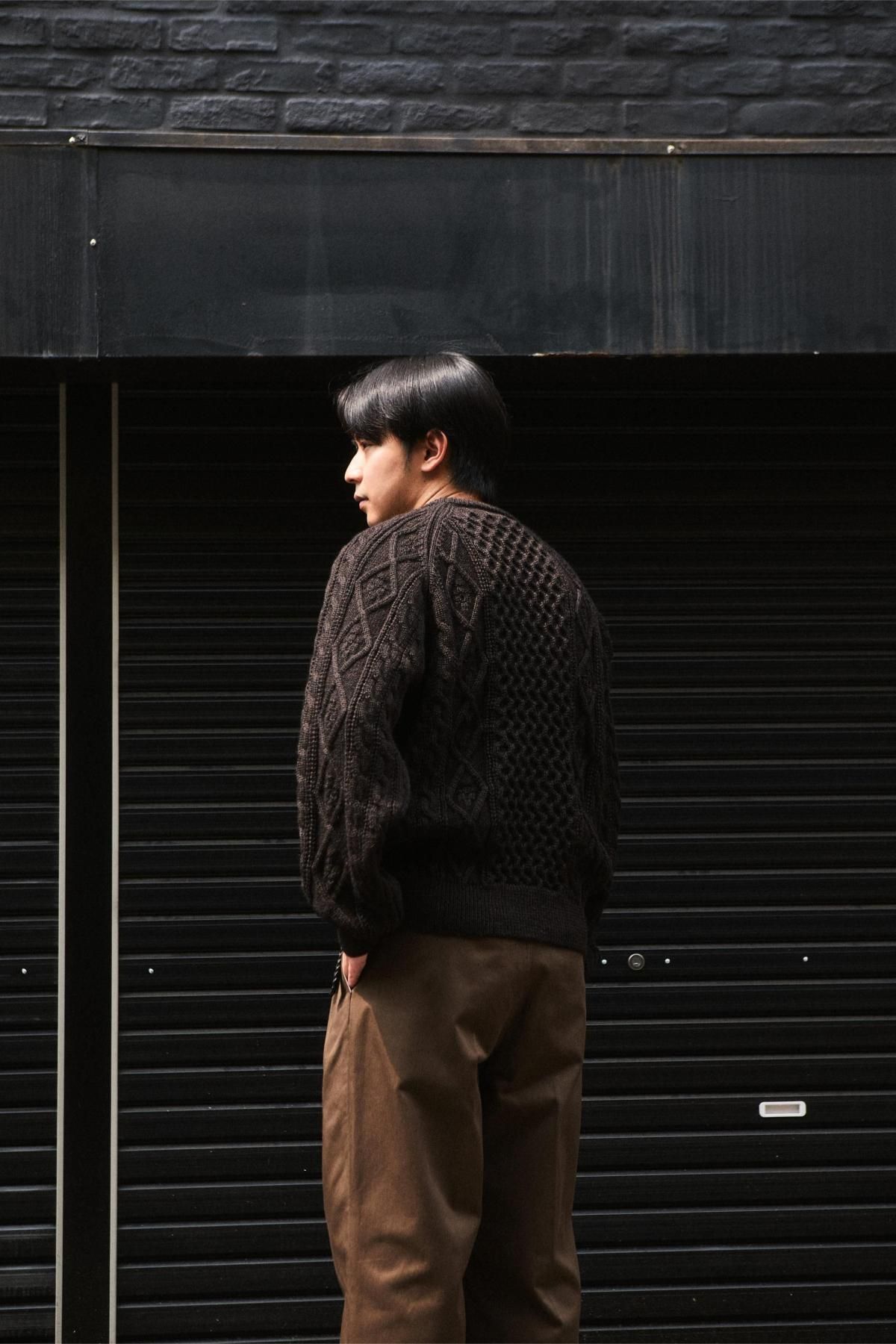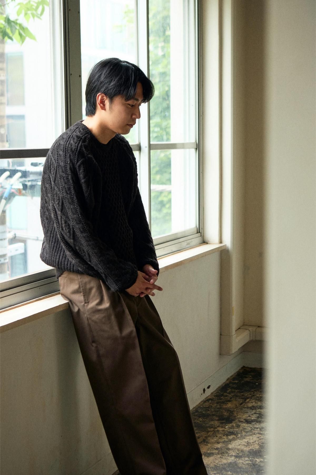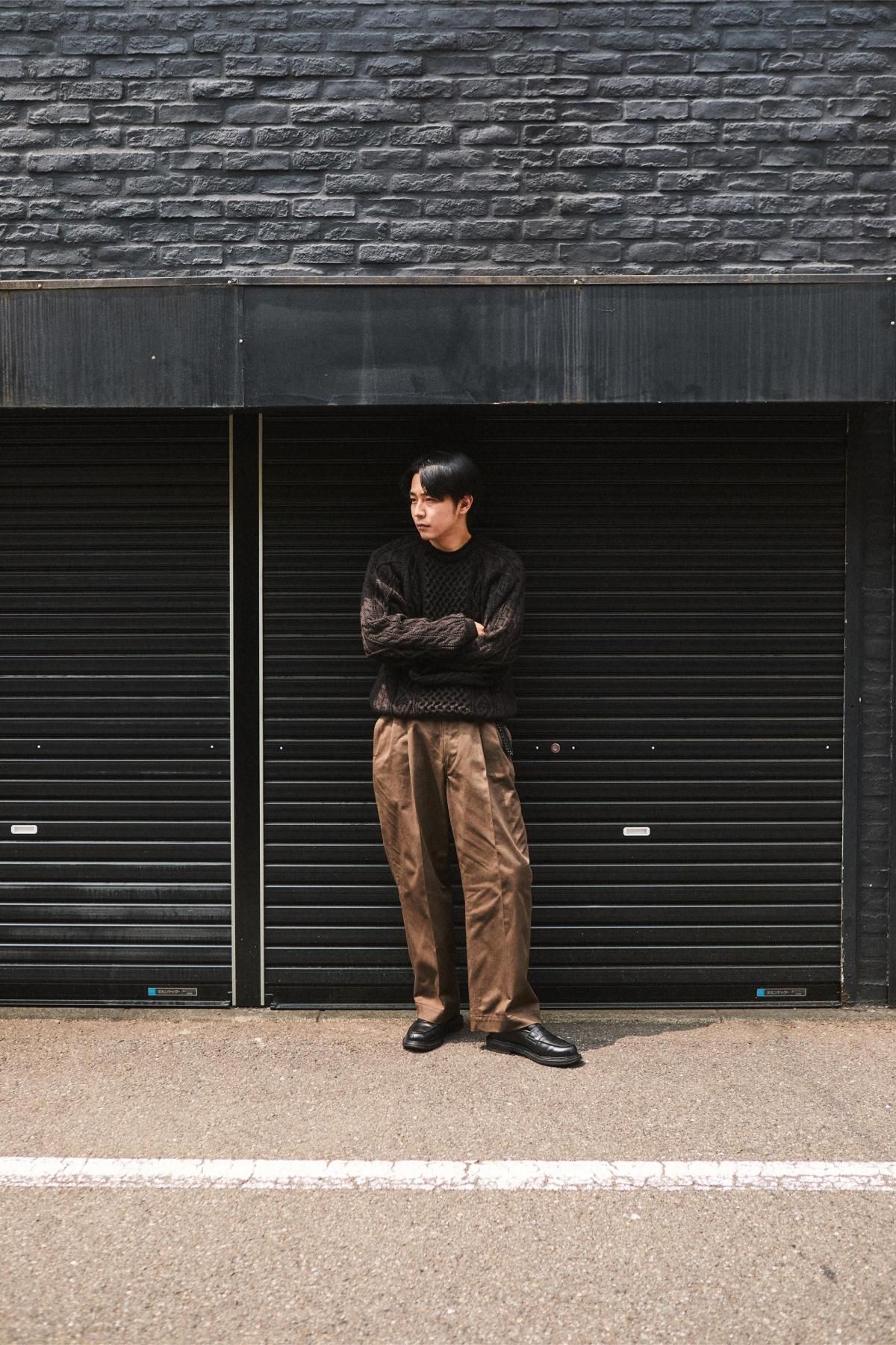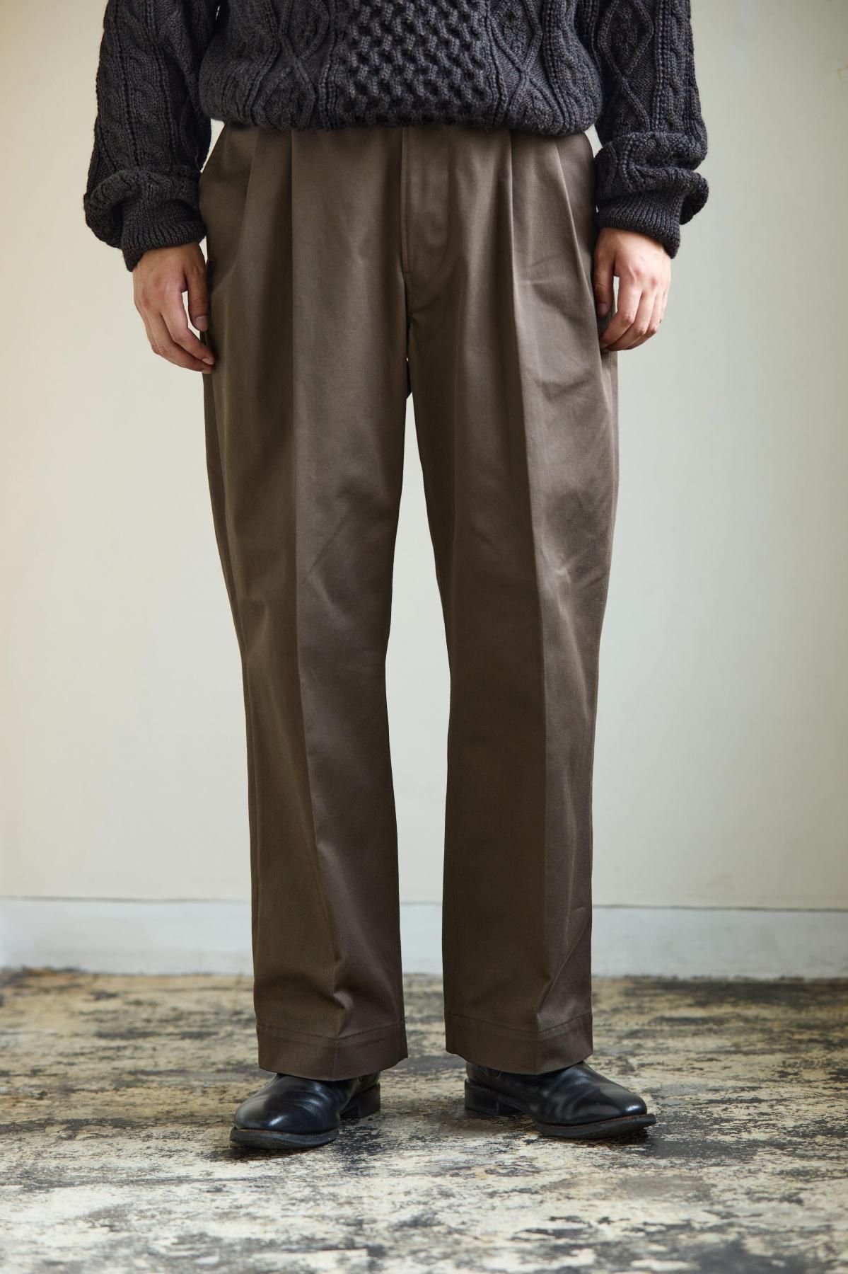 綿糸の紡績工程で夾雑物や短い繊維を徹底的に取り除き、毛羽立ちが少なく光沢に優れた上質なコーマ糸を使用。滑らかさとしなやかさを兼ね備えた、上品で強度のあるチノクロス。ツータックのワイドテーパード型。股上を深くして脇線をカーブさせた綺麗なシルエットが特徴。フロントはジッパーフライ仕様。内掛け釦付きでフィット感を高めることが可能。ピスポケットは片玉縁の釦留め。マーブル調の釦にはバッファローホーンを使用。全体的にクラシック感のある雰囲気に仕上げている。