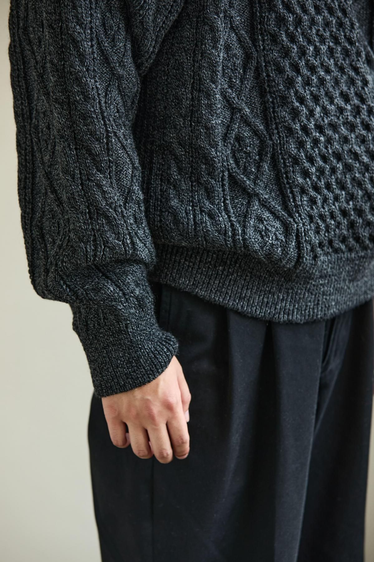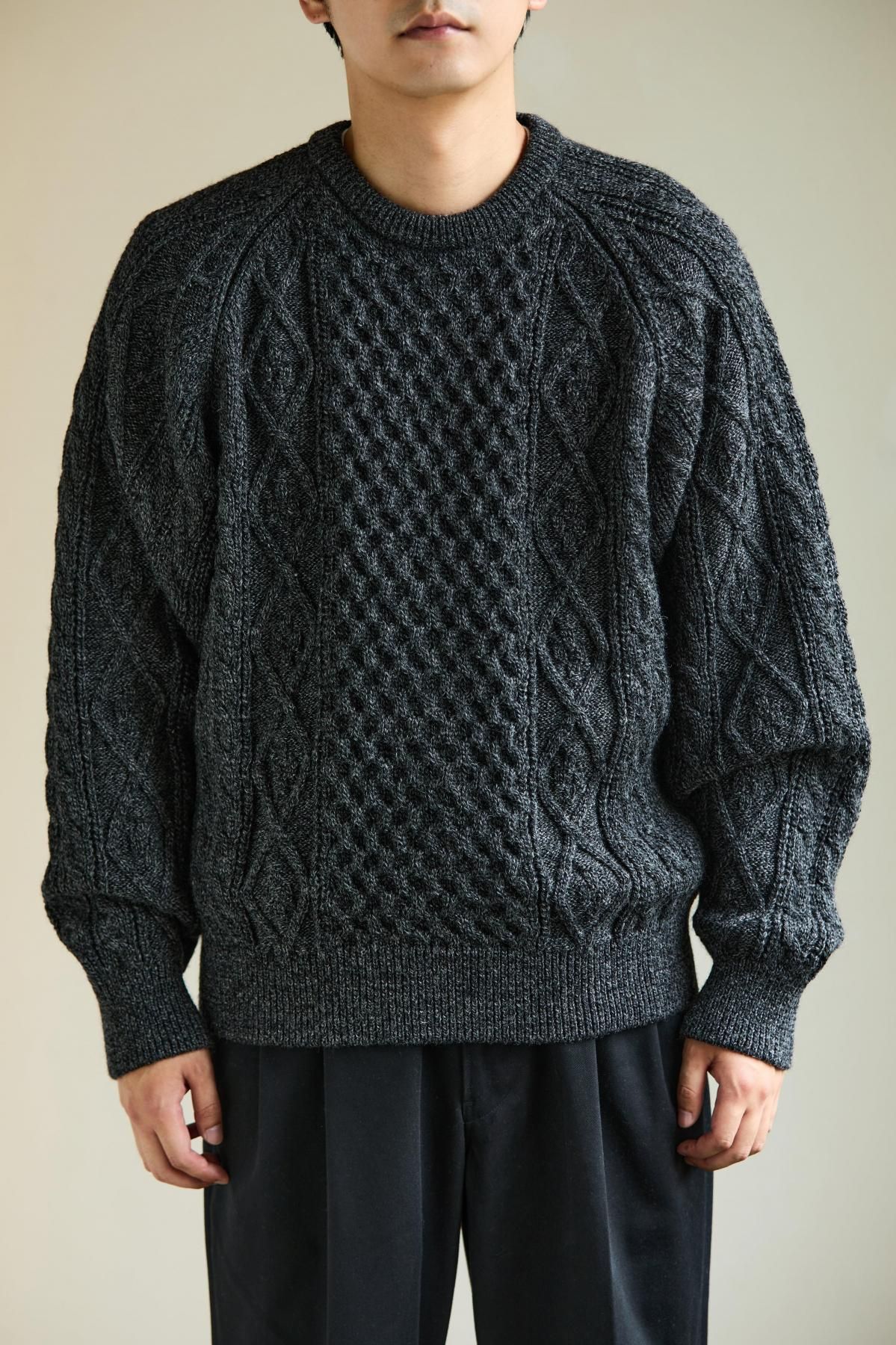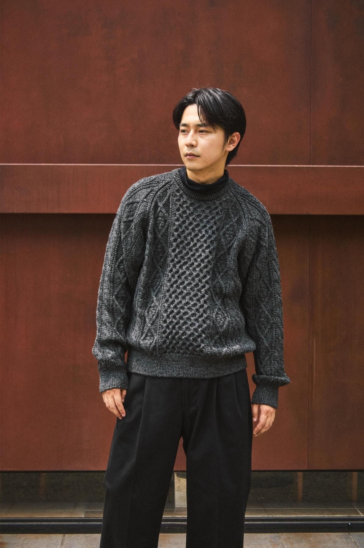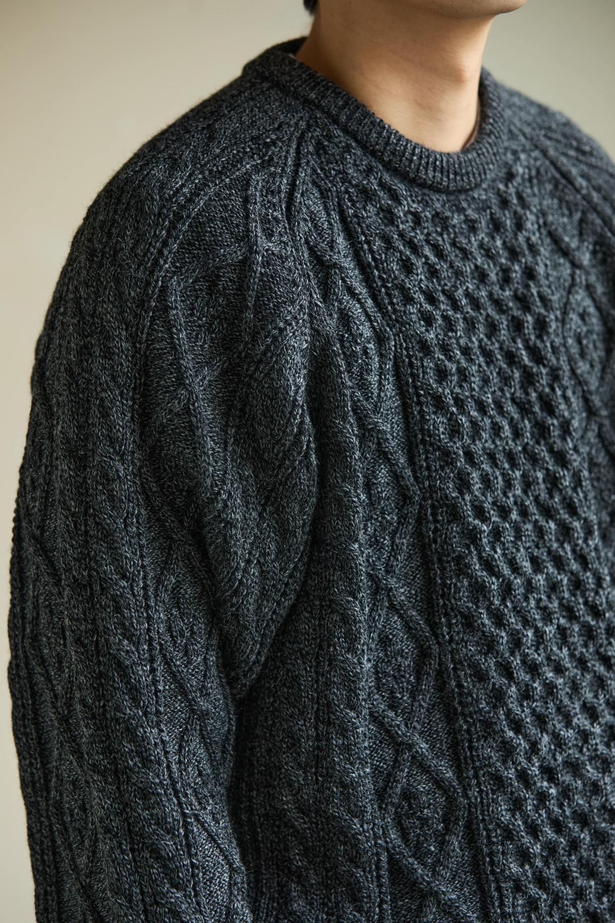 荒々しくハリのある英国羊毛と、柔らかい南米ウールをブレンドした糸を使用。弾力性・バルキー性・耐久性があり、型崩れのしにくいトラディショナルな部分と軽さを併せ持った素材。その糸を4本合わせて、5Gで度詰めして編み立てることで、厚みのある立体的な柄に仕上げている。デザインは3つの柄で構成されたアラン模様。勤勉に働く蜂への賛辞を表すハニカム柄、富や財宝の象徴を表すダイヤモンド柄、漁師の使う命綱や農夫の収穫物を束ねる綱を表すケーブル柄。両色ともに杢糸を使用し、独特の霜降り模様で各柄を引き立てている。型はベーシックなクルーネックだが、肩巾を選ばないラグランスリーブに仕立てた。