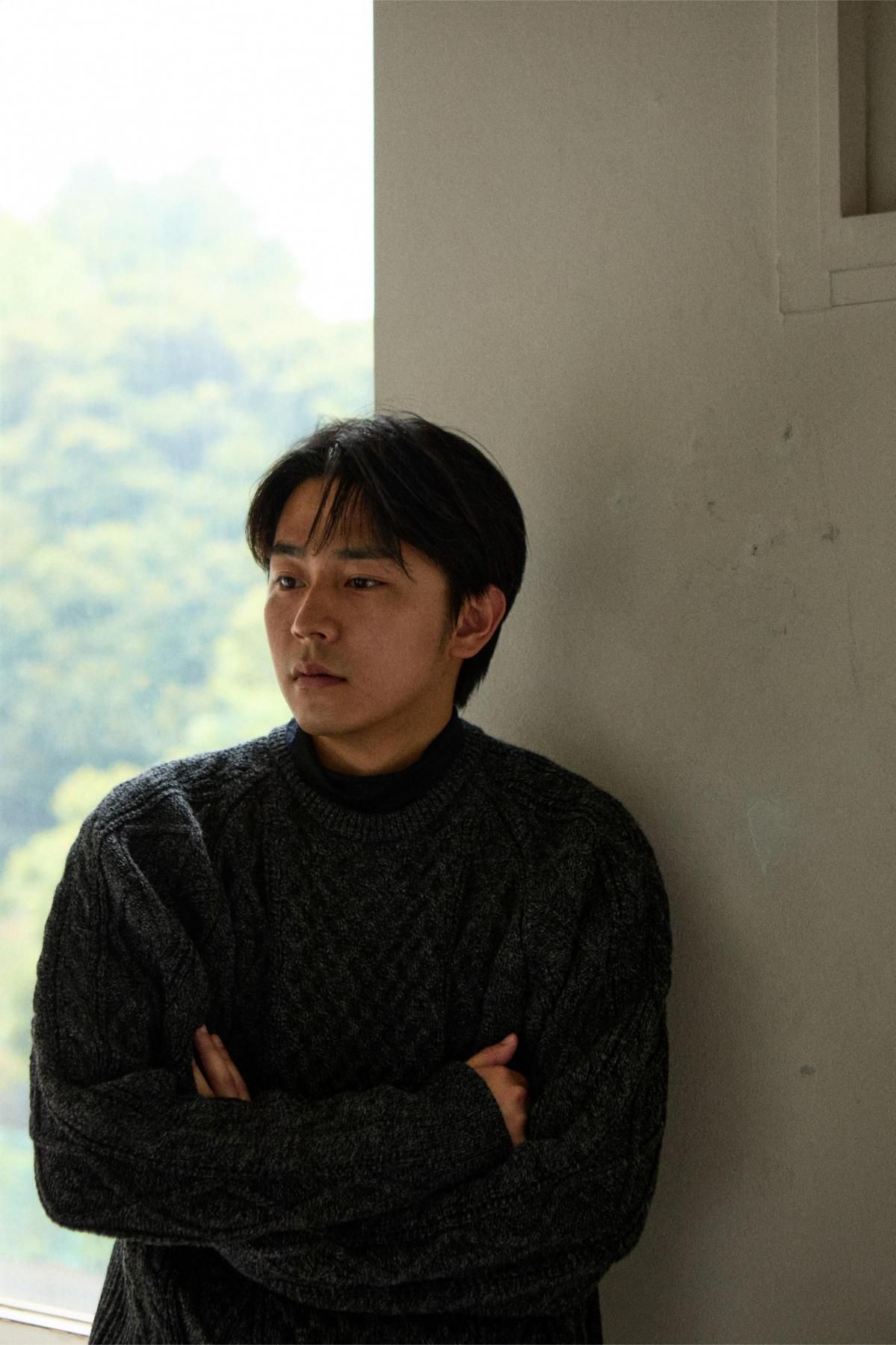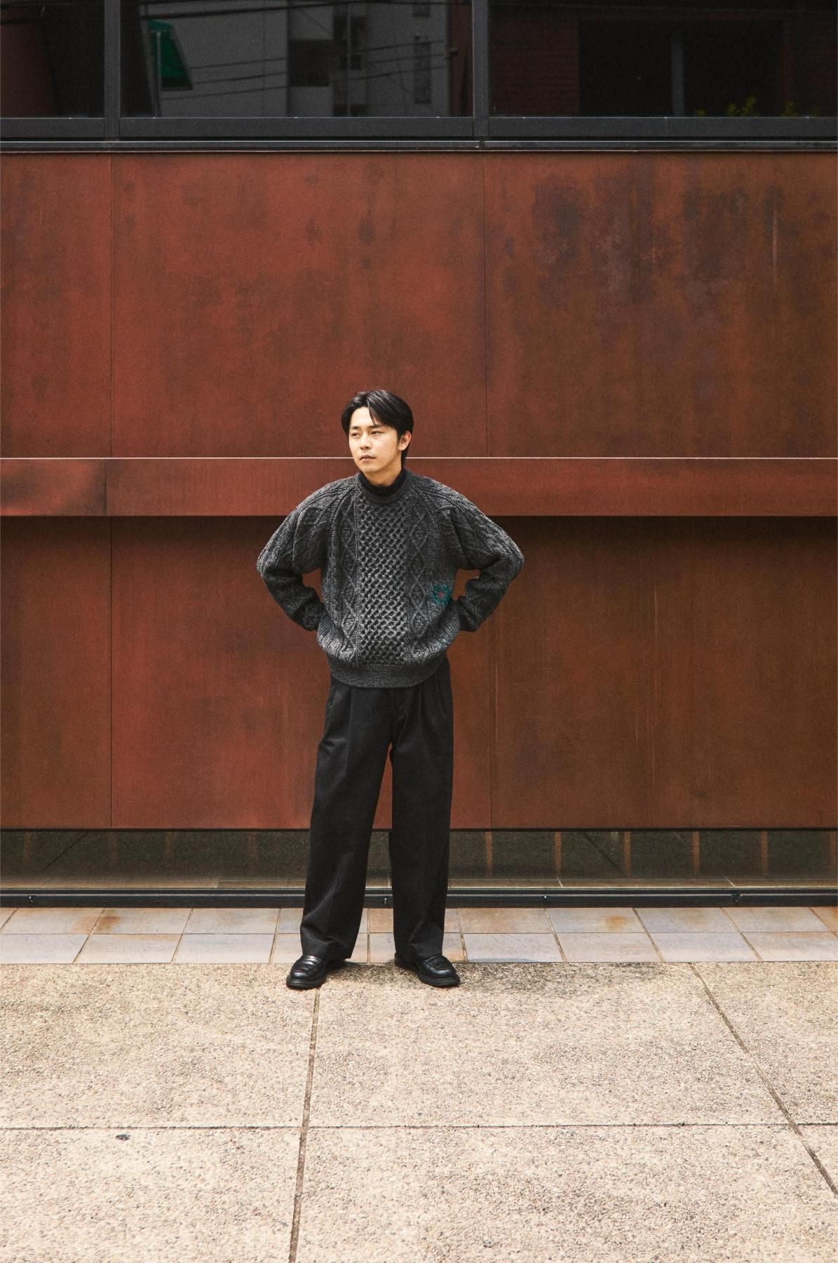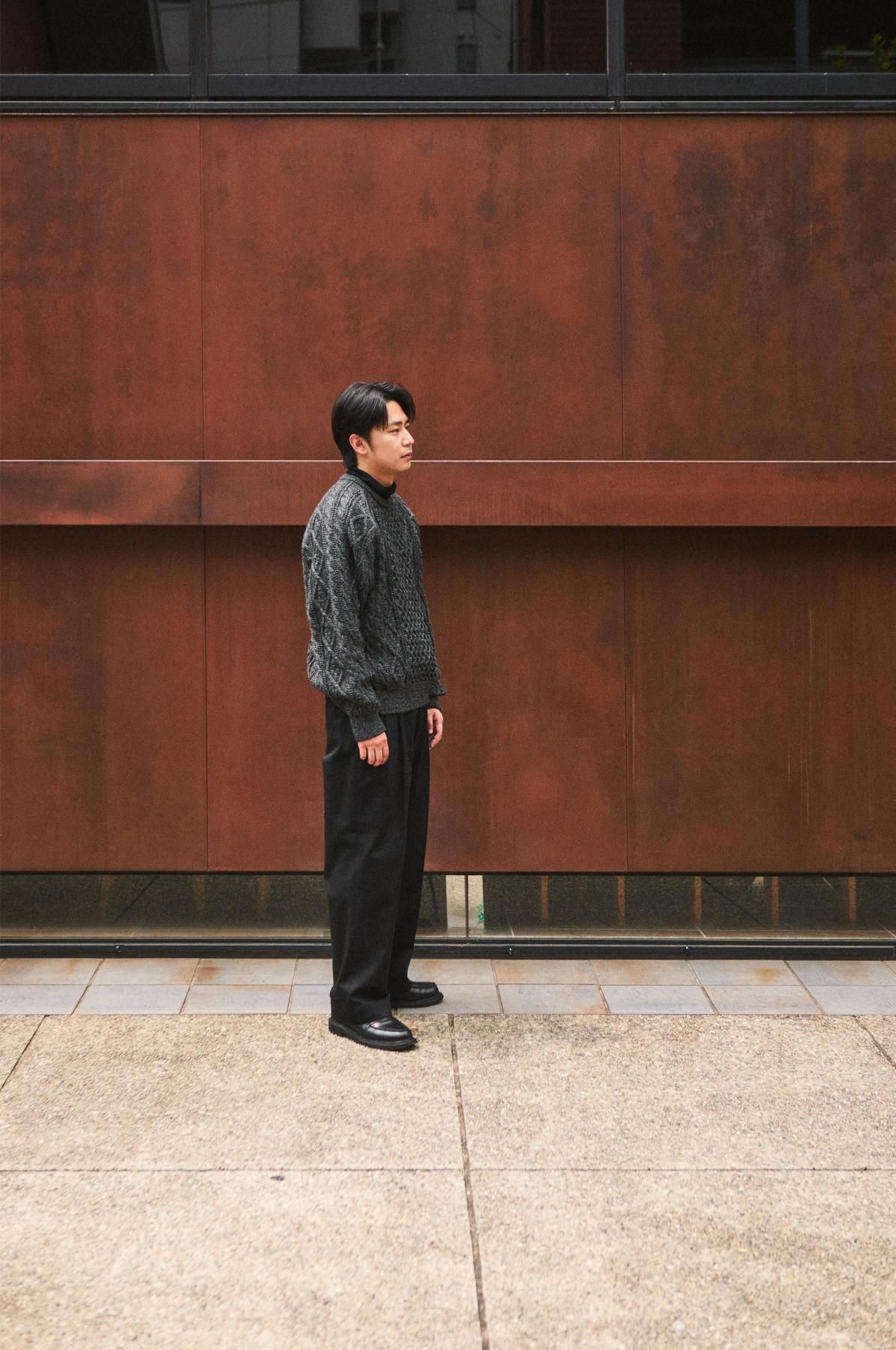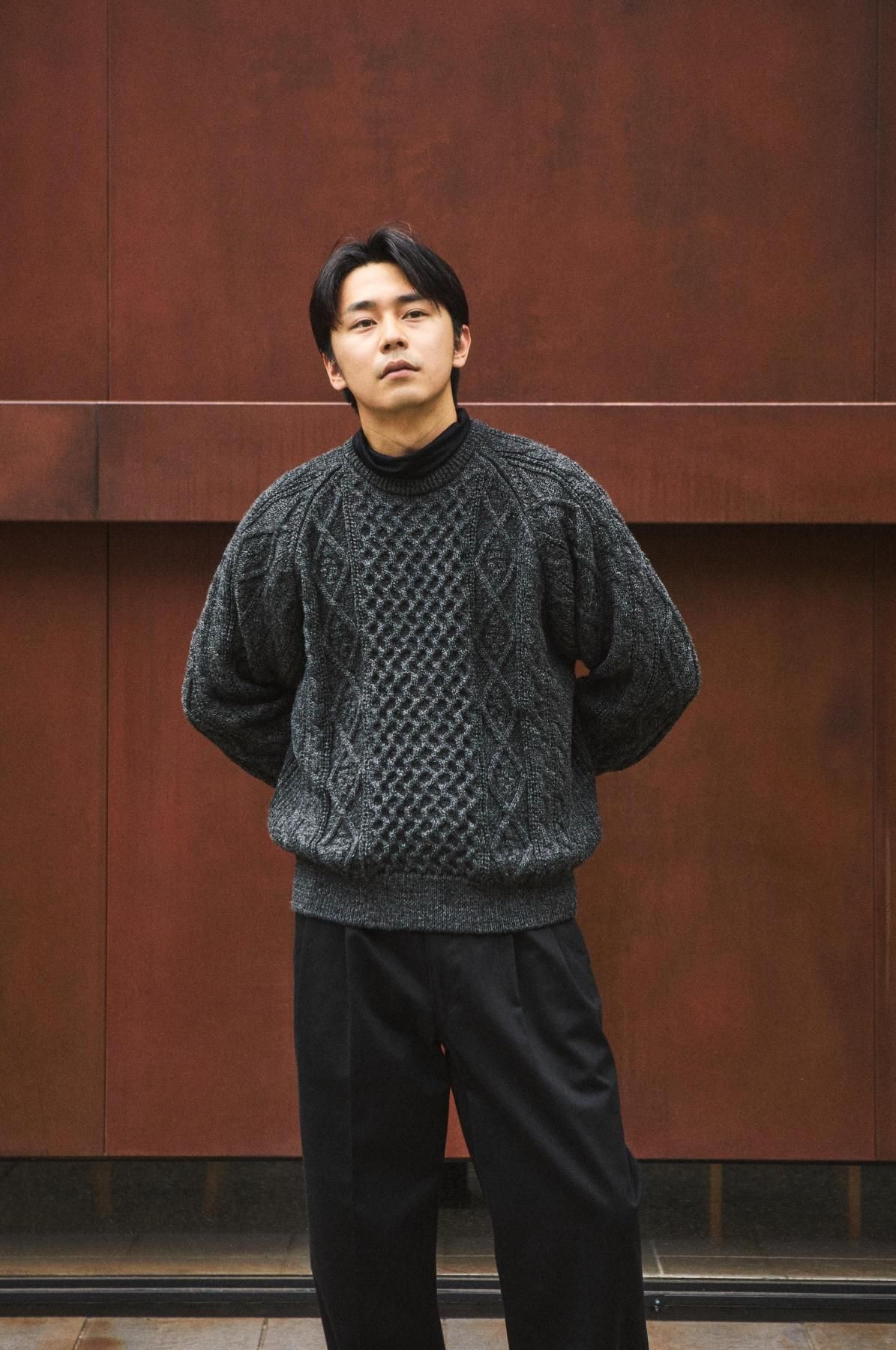 荒々しくハリのある英国羊毛と、柔らかい南米ウールをブレンドした糸を使用。弾力性・バルキー性・耐久性があり、型崩れのしにくいトラディショナルな部分と軽さを併せ持った素材。その糸を4本合わせて、5Gで度詰めして編み立てることで、厚みのある立体的な柄に仕上げている。デザインは3つの柄で構成されたアラン模様。勤勉に働く蜂への賛辞を表すハニカム柄、富や財宝の象徴を表すダイヤモンド柄、漁師の使う命綱や農夫の収穫物を束ねる綱を表すケーブル柄。両色ともに杢糸を使用し、独特の霜降り模様で各柄を引き立てている。型はベーシックなクルーネックだが、肩巾を選ばないラグランスリーブに仕立てた。